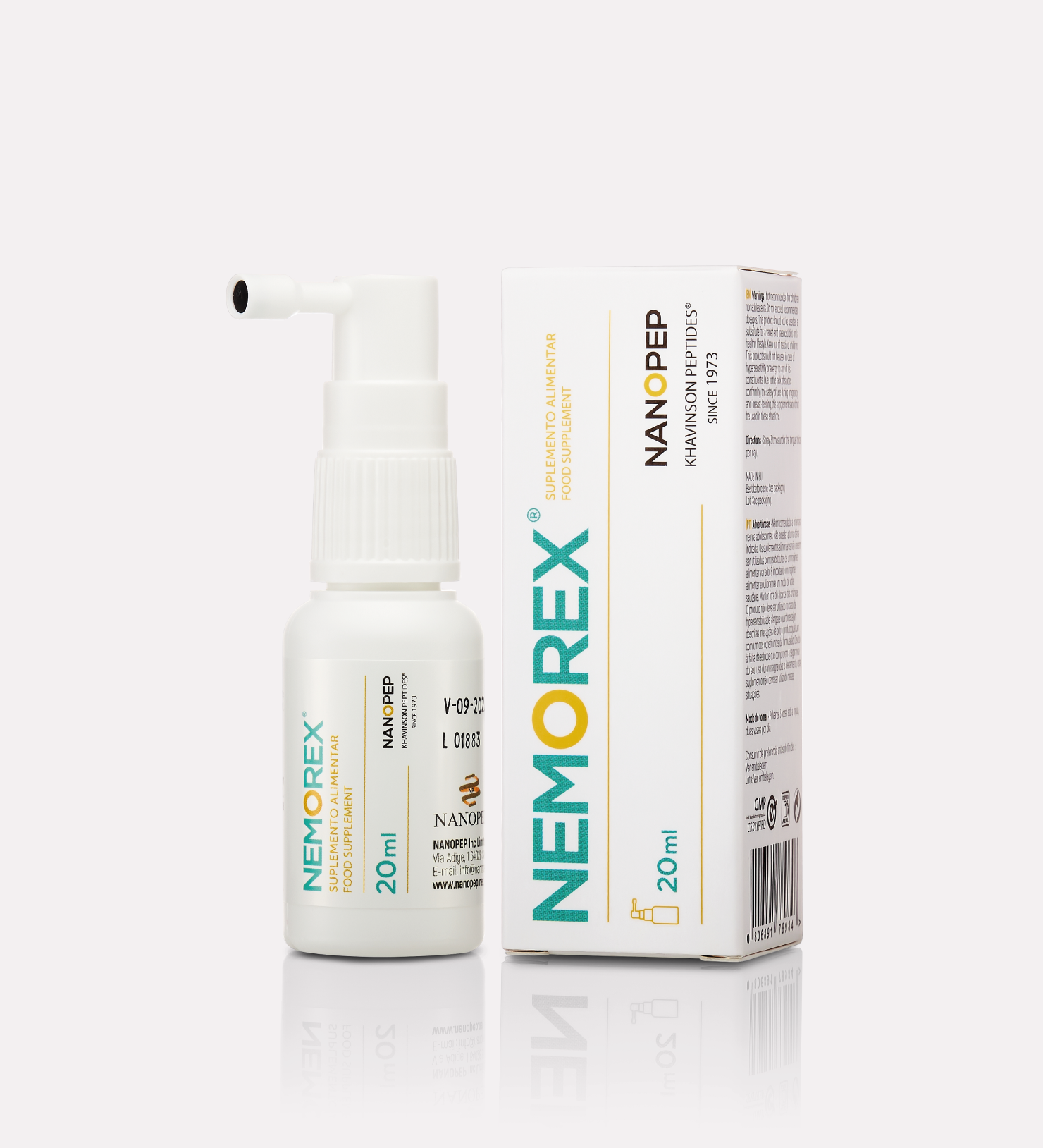 NEMOREX Spray is a new generation of food supplements based on 2 bioregulators: EW and KE. The first one is shown to activate the homeostasis processes responsible for the normalization of the functioning of the T- and B- immune systems as well as it helped suppress the replication of viral proteins in the infected cells. Thus, increasing the responsiveness of the immune cells to external and internal inflammatory factors.